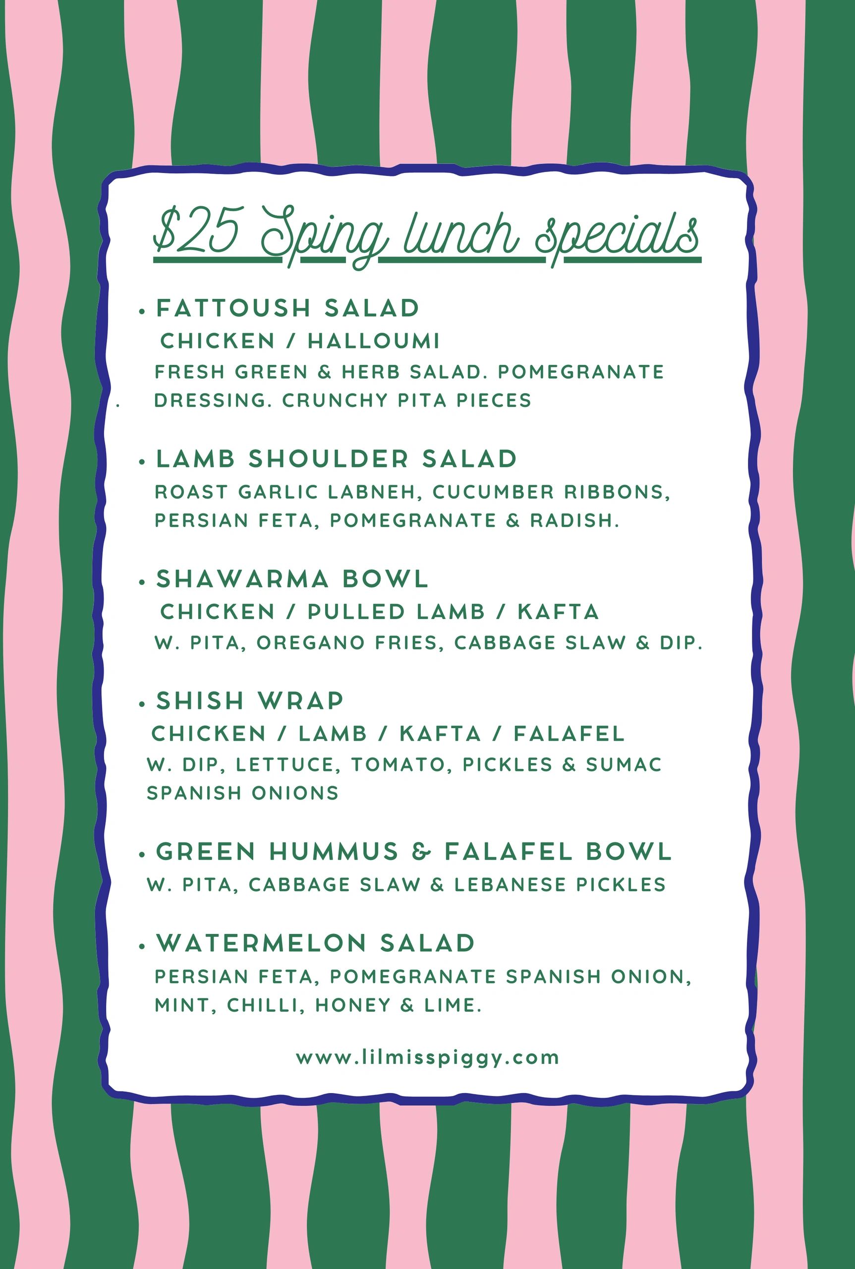 Lil' miss piggy is a quircky eclectic restaurant serving a sophisticated modern Australian take on traditional Middle Eastern cuisine. ...Serving only the freshest ingredients for breakfast, lunch & dinner.